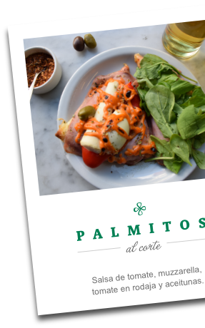 Salsa de tomate, muzzarella, jamón, morrón, palmitos, huevo duro, salsa golf y aceitunas